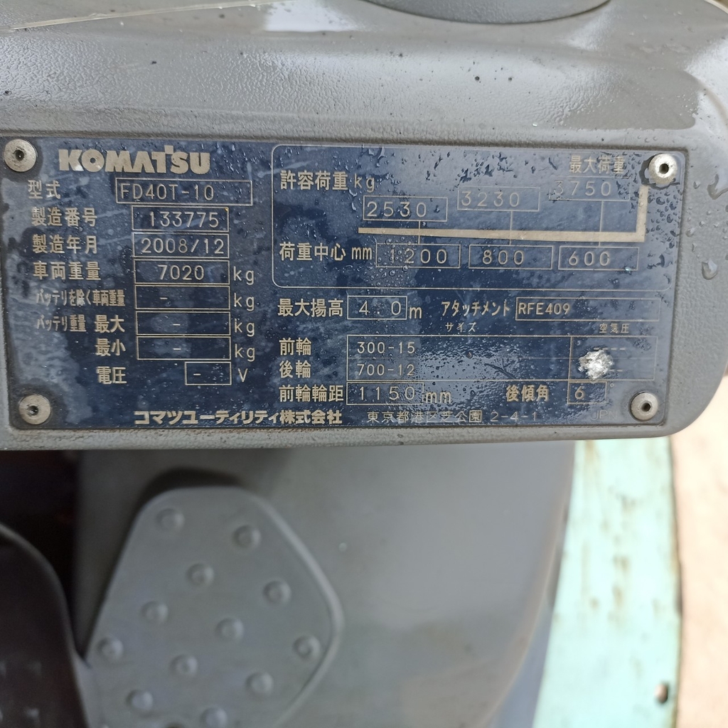 XE NÂNG DẦU 4 TẤN KOMATSU FD40T-10 137364 XUẤT XỨ xe nâng đã qua sử dụng nhập khẩu Nhật Bản NHÃN HIỆU KOMATSU MODEL FD40T-10 SERI 137364 NĂM SẢN XUẤT 208 KHỐI LƯỢNG XE 7260KG NHIÊN LIỆU SỬ DỤNG Dầu Diesel TẢI TRỌNG NÂNG 4 TẤN CHIỀU CAO NÂNG 4M KIỂU LỐP Lốp đơn CHỨC NĂNG xoay 360 độ SỐ ĐỘNG CƠ 4D95L SỐ GIỜ XE ĐÃ CHẠY HỘP SỐ số tự động